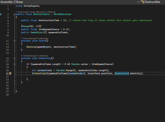 This function handles destructible objects like the bricks. When a destructible object is destroyed, it has a chance to spawn an item at its location. If item spawning is enabled, it randomly selects an item and instantiates it at the object's position. The object is automatically destroyed when the Start method is called.