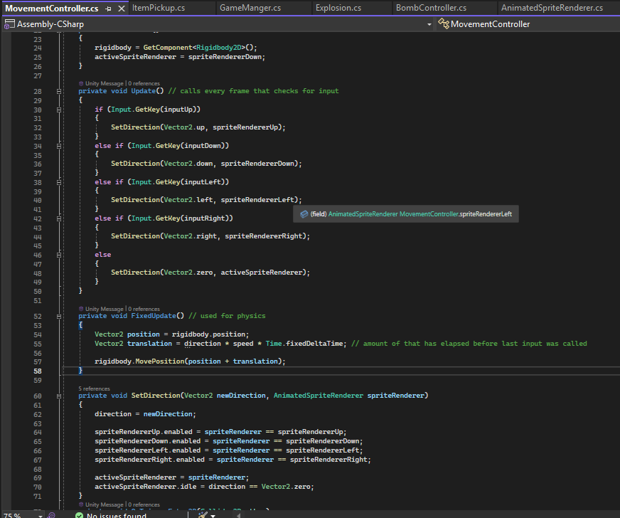 This manages player movement, animation, and death functionalities. The MovementController moves the player based on key inputs and updates the sprite renderer for direction or idle state. movement is applied using the player’s speed. On explosion collision the DeathSequence method disables controls, plays a death animation and deactivates the player.