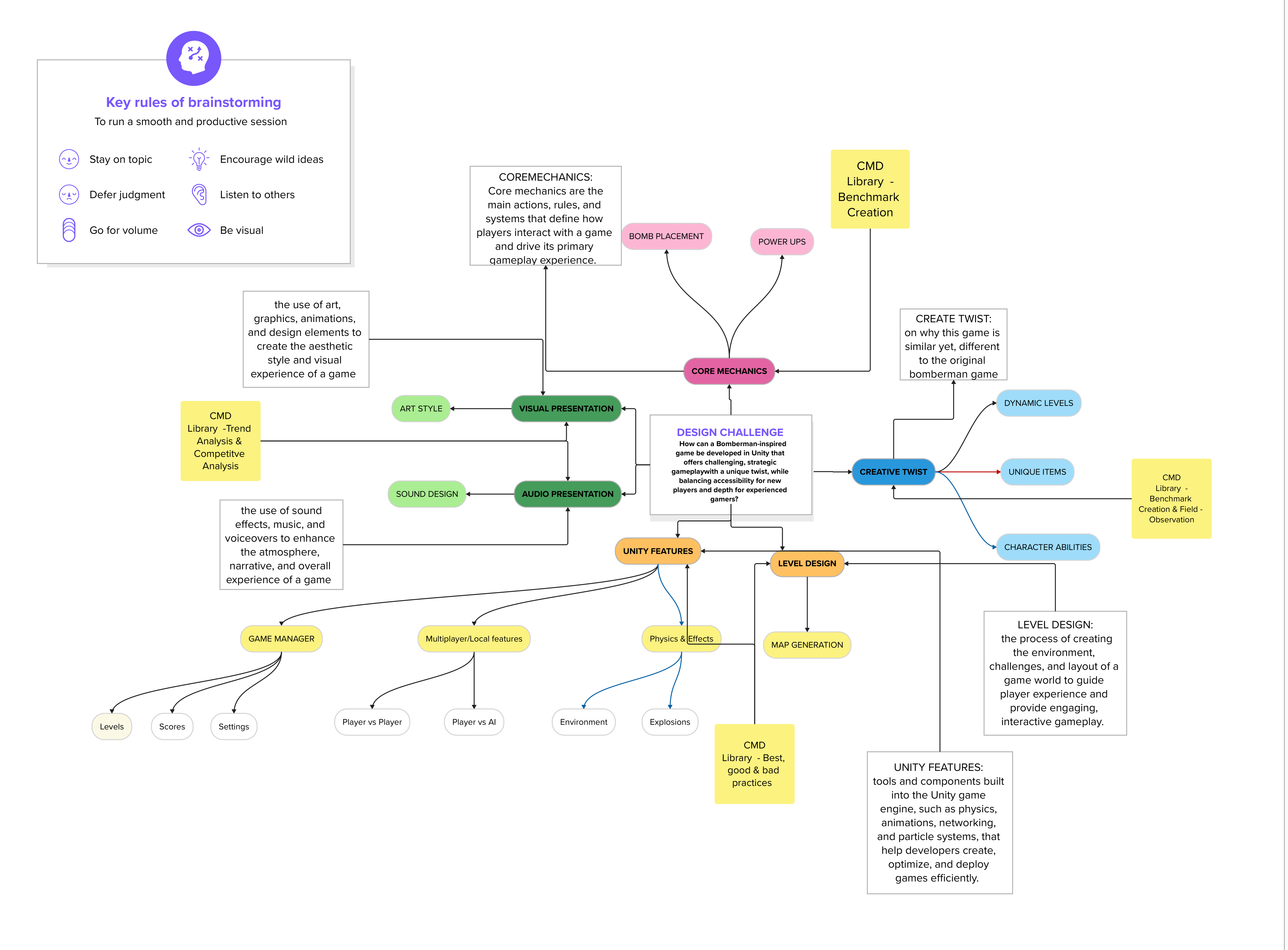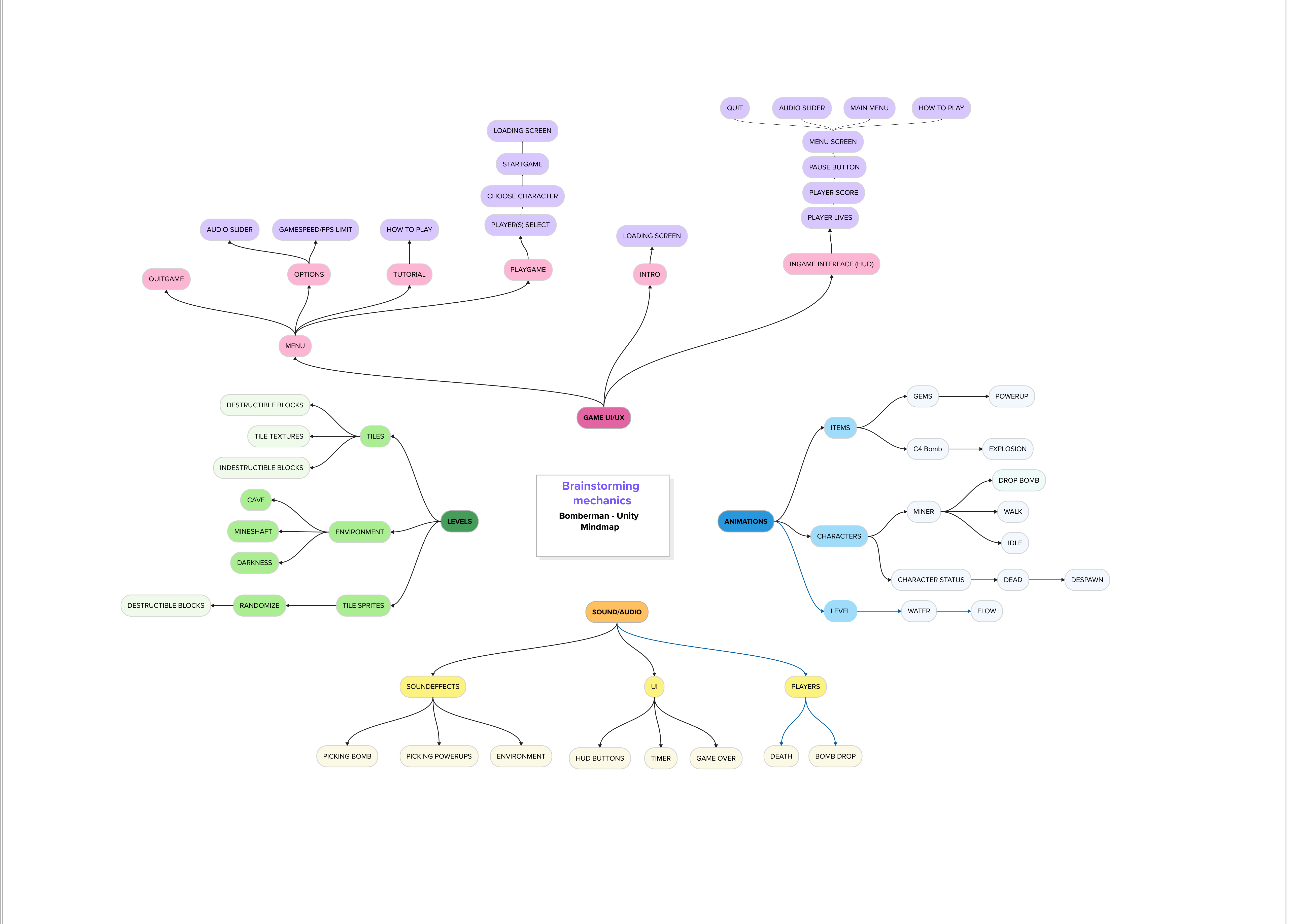 I’ve created another mind map to dig deeper into the functionalities and features that will be implemented in the game. These features are essential because without them, it wouldn’t feel like a Bomberman game. I came up with this by looking at both old and new Bomberman games, but my prior experience playing the game also helped a lot in shaping this mind map.