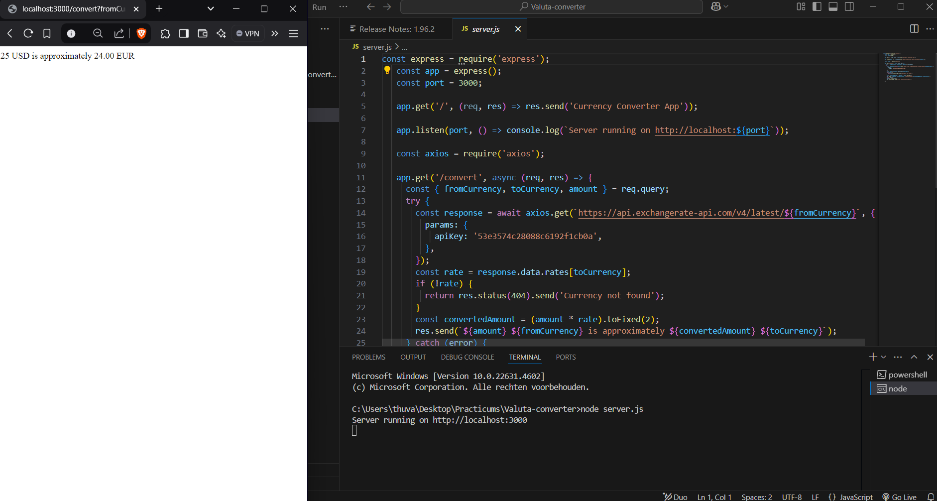 The second practicum is about a valuta converter made with Nodejs. I did the exact same steps as above to setup my project. Basically what this application does it converts US Dollars to Euros.