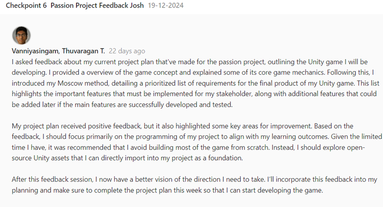 I learned a lot while making this project plan since it’s my first time creating one for a game. It was definitely challenging, but after going through and validating the content I wrote in the document, I feel like I now have a solid foundation. This will really help me move forward and accomplish developing my 2D Unity game.