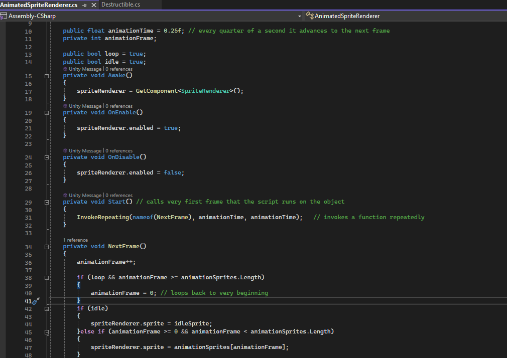 This function controls an animated sprite using a SpriteRenderer. It has an idle sprite and an array of animation frames, which allows the sprite to change over time. The animation is managed by a timer, and the frames update at a specified interval. The animation can either loop or stay on the idle sprite if the idle flag is set to true. The script automatically switches between the idle sprite and the animation frames, depending on the frame count and whether the loop setting is enabled.