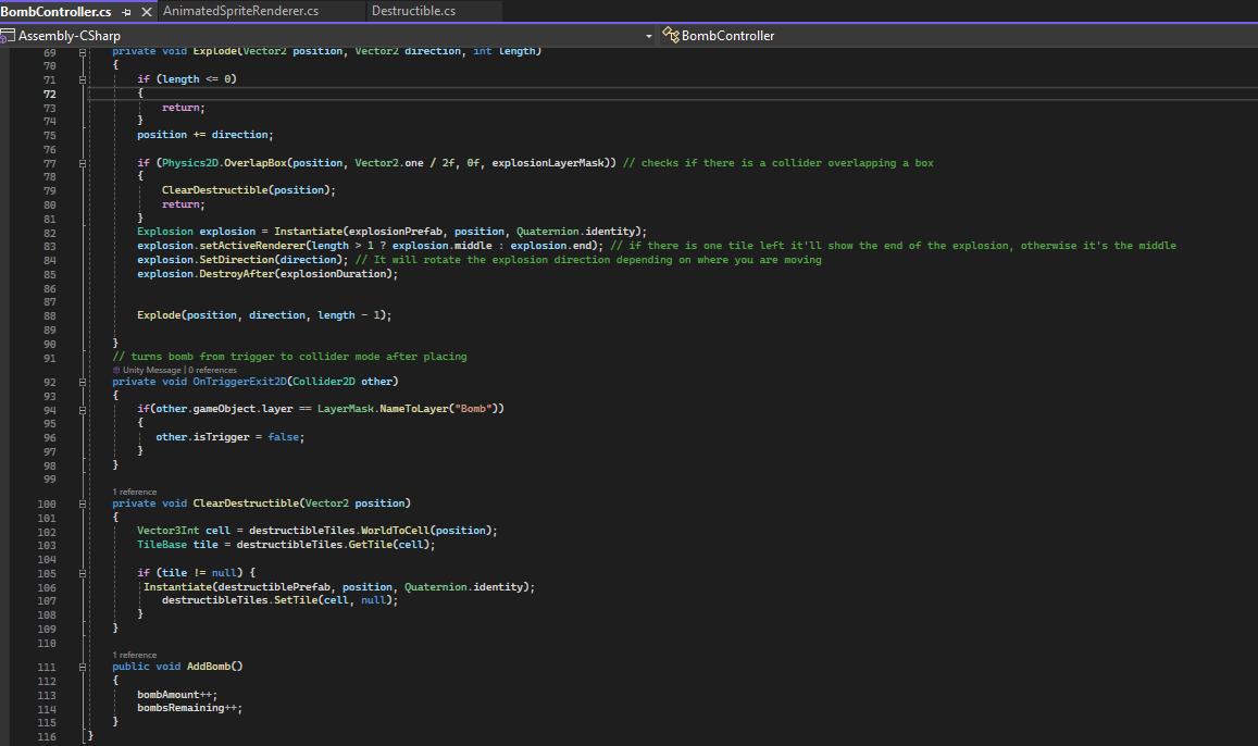 This manages player movement, animation, and death functionalities. The MovementController moves the player based on key inputs and updates the sprite renderer for direction or idle state. movement is applied using the player’s speed. On explosion collision the DeathSequence method disables controls, plays a death animation and deactivates the player.