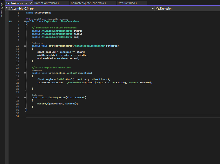 This function an explosion using three objects: start, middle, and end, for different animation stages. The setActiveRenderer method switches between these stages, while SetDirection rotates the explosion using Quaternion.AngleAxis. The DestroyAfter method destroys the explosion after a set time.