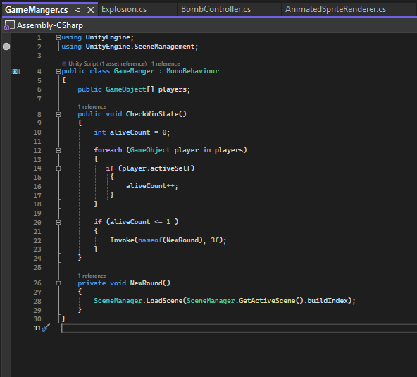 This script function manages the gamestate. It checks if there’s one or fewer active players left using the CheckWinState method, counting how many players are still active. If only one or no players remain, it triggers a new round by invoking the NewRound method after a 3-second delay. The NewRound method reloads the current scene using SceneManager.LoadScene and restarts the game.