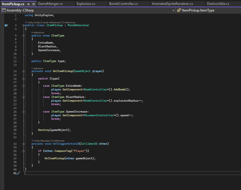 This function handles the item powerups. The ItemPickup class defines item types (ExtraBomb, BlastRadius, SpeedIncrease) with an enum. When a player collides with an powerup, the OnItemPickup method applies the corresponding effect like adding a bomb, increasing blast radius or boosting player speed.