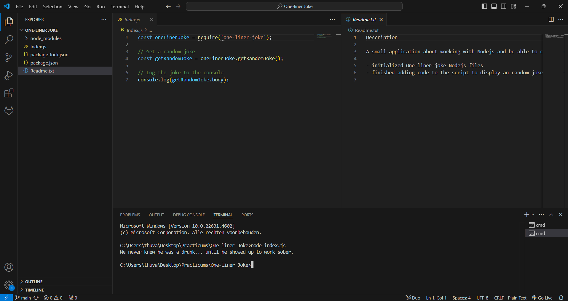 In short this application fetches and displays random jokes which is already in an different Json file. Below you can see the code and what it does to get the end result, which is shown in the terminal.