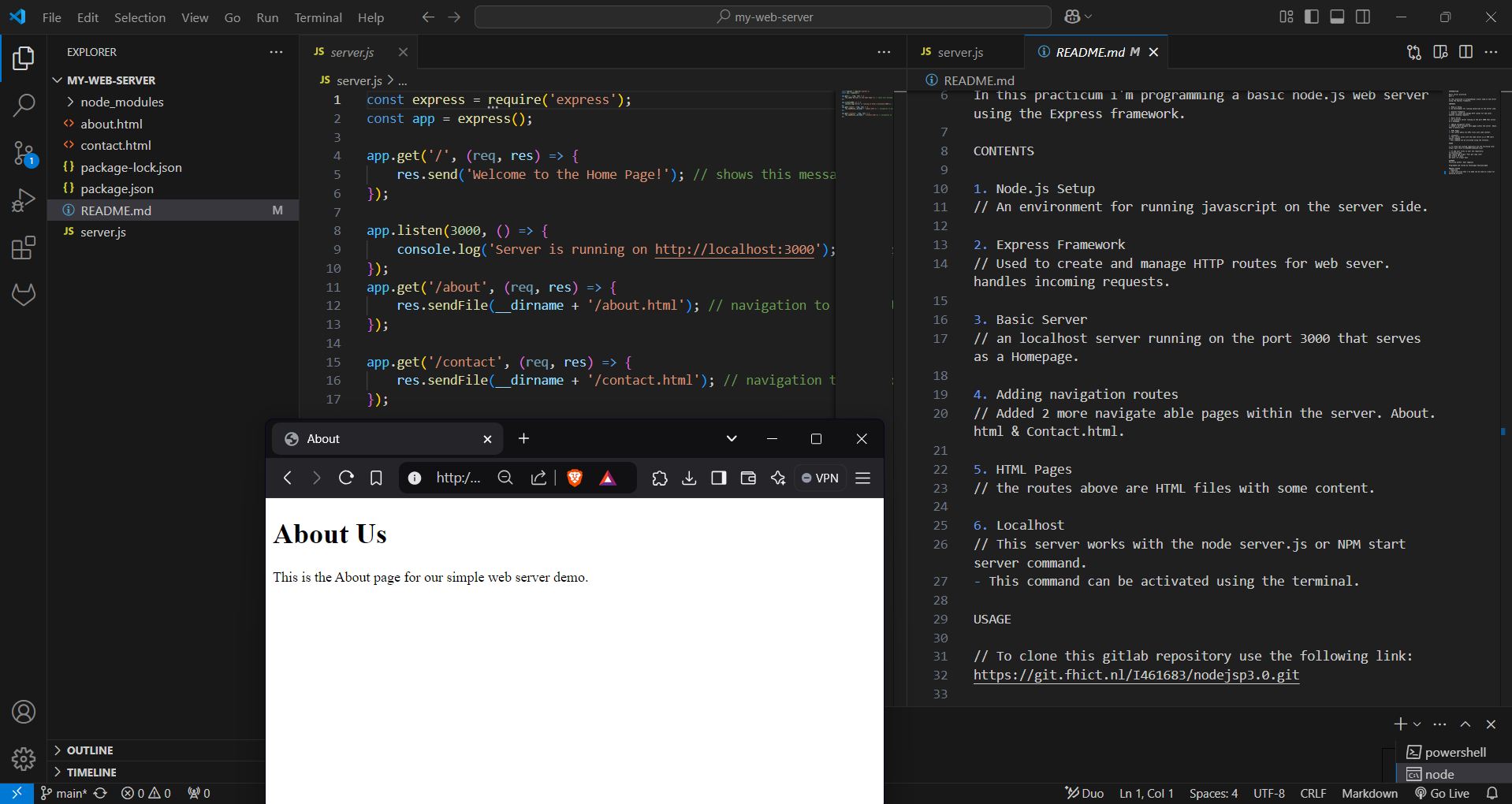 This practicum was about making basic webserver with node.js using the Express framework in Localhost. This practicum taught me how easy it is to create routes within this framework and get direct results. The steps that I followed to reach the end result below was straightforward, below you can see how I’ve done it.